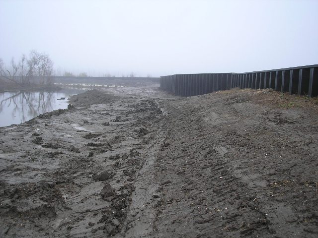 Levee and Sheet at site showing day - The water on the marsh side is at +1 to +2 depending on the tide and wind. The ground on the pump house side is at 0.